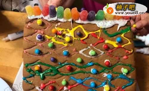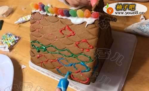 4用糖霜将彩色的小糖粘在屋顶做装饰。