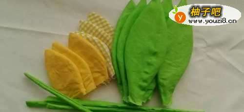 1.在纸上画出郁金香的花瓣和叶子,沿着边线剪出形状, 将叶子和花瓣的纸片用珠针固定在双层布料上。