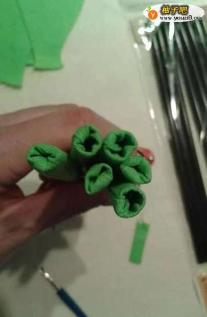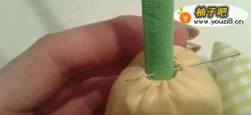 77.将花瓣小口边缘和花茎缝合在一起,接着将叶片的开口处的布向内部凹进去,叶片包住花茎进行缝合。