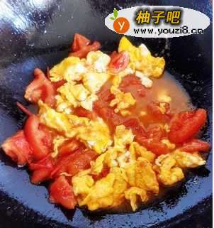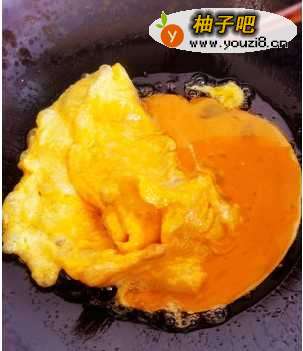 4加入鸡蛋翻炒,并加入少量水。加入盐,糖调味