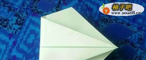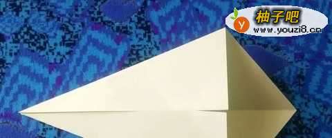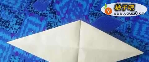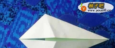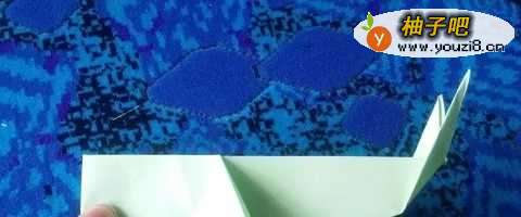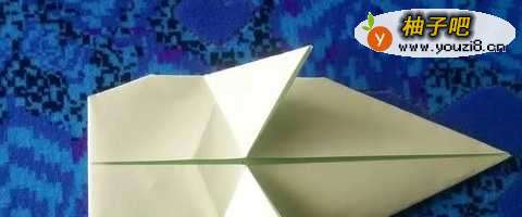 9沿中间折痕将整个向后折,然后再沿虚线向上折,沿实线剪开尾巴。如图