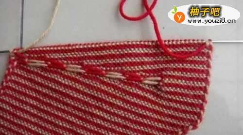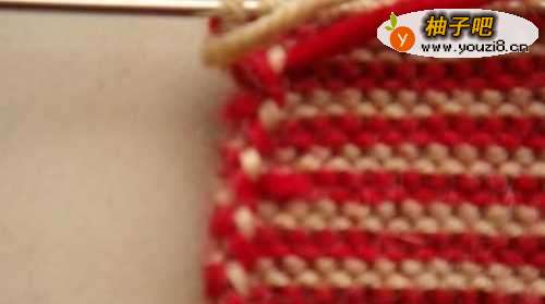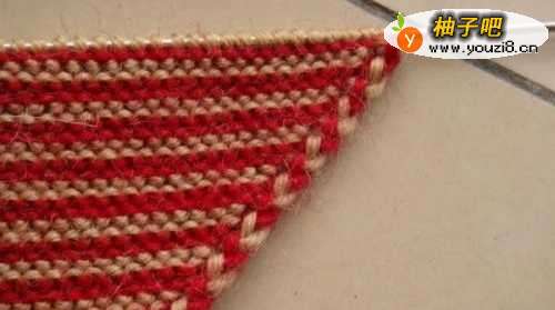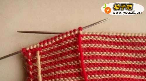 4织好中间的部分后,红色线开始往回梭。即:织红线时,先织最后的十几针,然后把刚才余下的5针(红)一起织,织完这5针后,立刻换成黄线织过去,回头来再织前面余下的5针(黄),如此反复,直至把前面梭的40针全部织完。