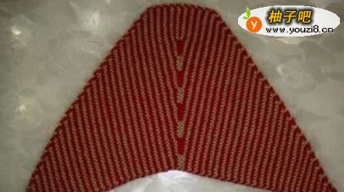 5全部织完了中间余下的40针以后,织第一行就注意开始收针,即:原来加针的地方,现在就变成最后两针合为一针,注意不要拉得太紧,边缘太紧容易让鞋面子变小,左右不对称。回头织的方法无变化。这样一直收到只余下6针就全部收针断线。现在的鞋面子犹如一只展翅的蝙蝠。