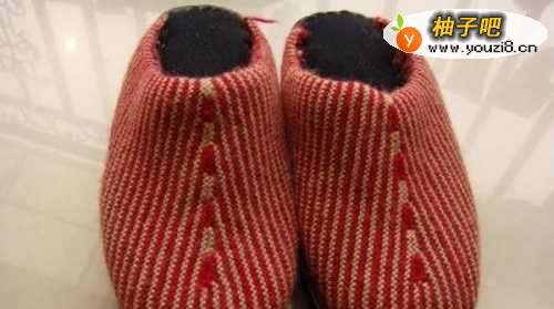 3、然后,用旧毛衣剪一双鞋垫的样子(也可以用线织鞋垫),缝在鞋底上。 4、最后,把里子翻过来,再把面子翻过来,一双毛线拖鞋就利完工了。