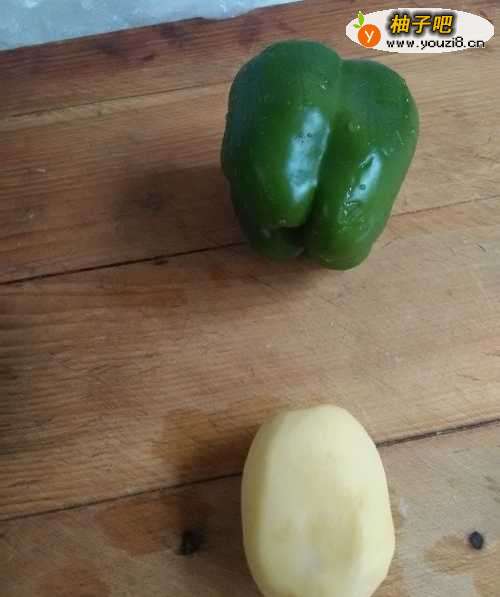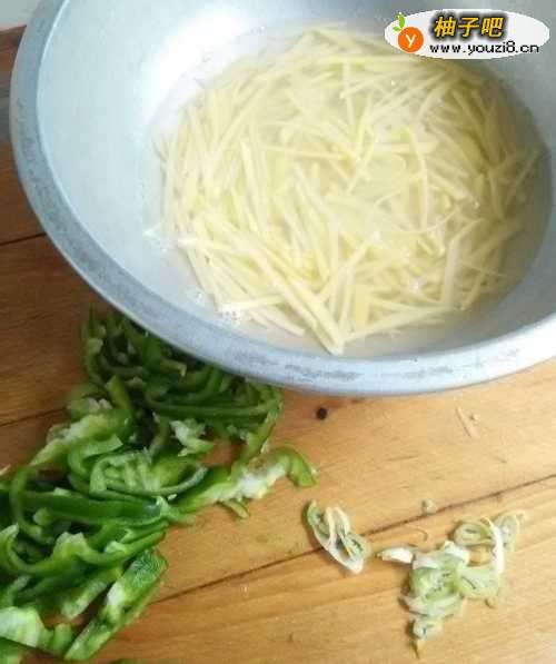 2将土豆和青椒都切成均匀的细丝,葱切成小片。