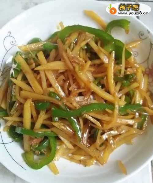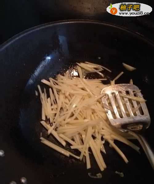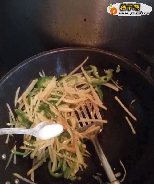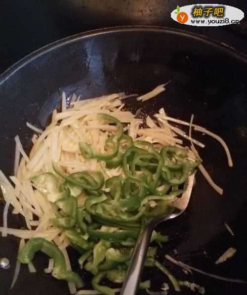 5再将青椒丝放入锅中,和土豆丝一起炒。