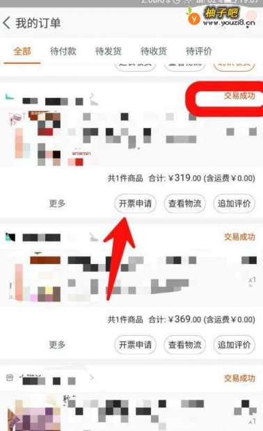 2点击图示位置“开票申请”。注意:这里需要交易成功之后的订单才能进行开票申请。