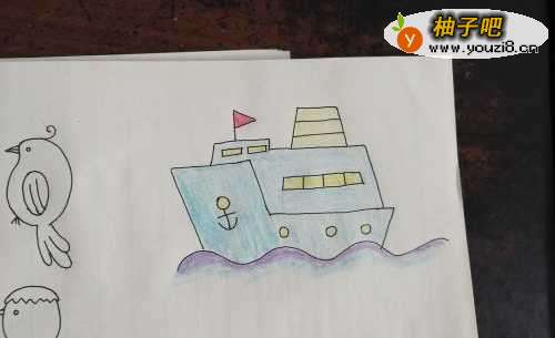 6我们把轮船上画上小红旗,最后用彩铅上色就可以了。