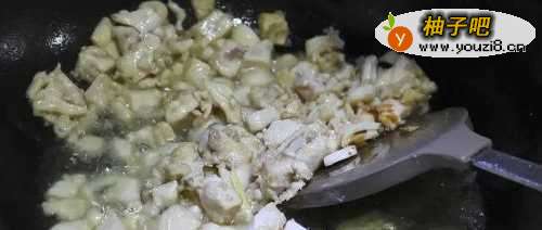4一切准备就绪后,热锅倒油,等油烧热以后,倒入鸡胸肉翻炒
