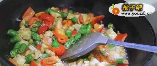 5接着倒入姜、蒜、酱油等调味料,翻炒至鸡胸肉变白后,倒入甜椒和青椒,继续翻炒
