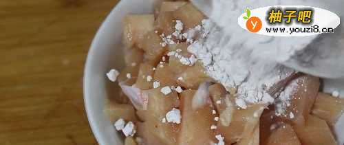 二:鸡胸肉切成丁状,加入红薯淀粉