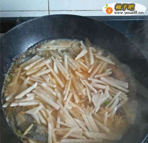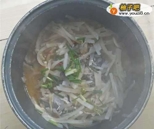 6再下切好的萝卜丝同煮,煎好的鲫鱼经不住久煮的,萝卜丝煮熟后,就可以尝一尝咸淡后关火出锅啦!