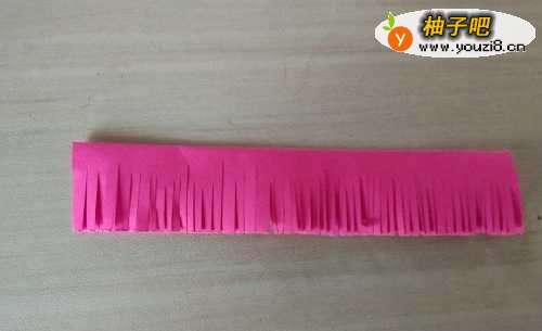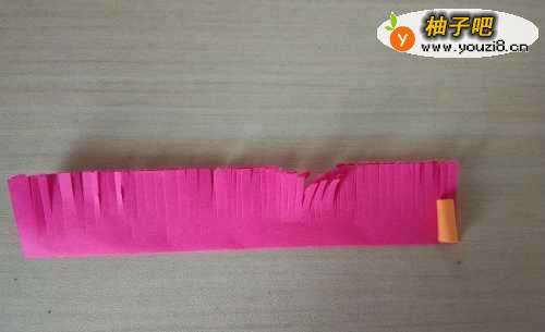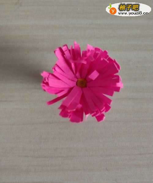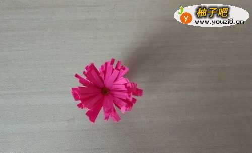 4把玫红色的纸剪成一条条的当做花,把橘黄色的卷成一个团就是花芯