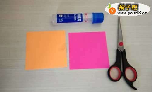 准备两张不同颜色的纸,胶水,还有剪刀备用