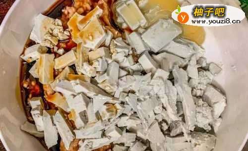 2将豆腐、猪肉、鸡蛋、酱油均匀搅拌