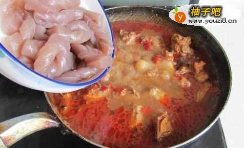 6下入焯过水的魔芋一起煮上五分钟,再加入适量的胡椒