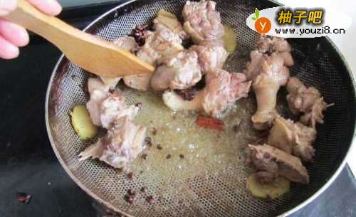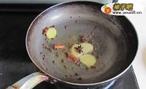 3将锅烧热, 下入适量的油, 下入大料和姜片煸炒(煸炒出香味后下入鸭肉小火煸炒)