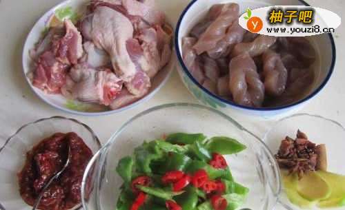 2准备好其他的材料, 鸭肉剁块, 青椒切成块, 姜片,豆瓣酱和大料