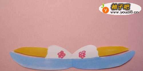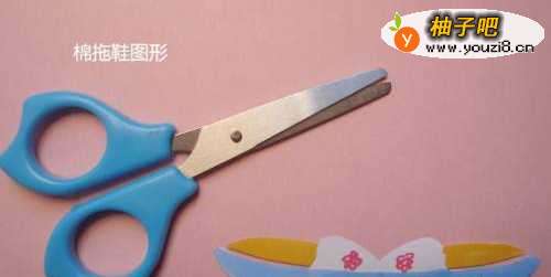 6最后,用浅橙色的马克笔,在剪出的棉拖鞋的顶部图形上,涂颜色,注意颜色要涂均匀,并用浅蓝色的马克笔给棉拖鞋的底部图形涂颜色,这样一个好看的棉拖鞋图形剪纸手工就制作好了,如下图所示。