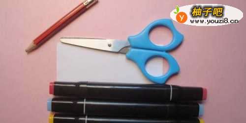 准备好,制作棉拖鞋图形剪纸手工的材料和工具,有白纸、正方形卡纸、马克笔、铅笔,剪刀,如下图所示。