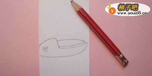 2接着,把正方形卡纸对折一半,并用铅笔在白纸上,画出棉拖鞋图形,根据对称图形,这里画出半个图形,如下图所示。
