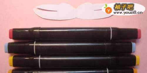 5然后,把棉拖鞋图形的剪纸展平,摆放在桌子上,并选择浅橘色和浅蓝色的马克笔,准备涂上颜色,如下图所示。