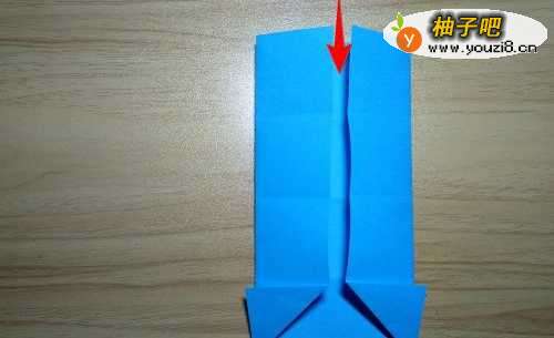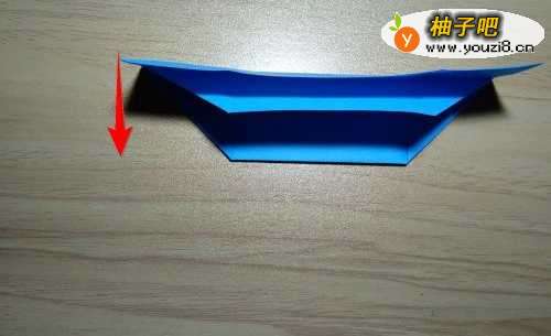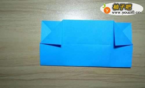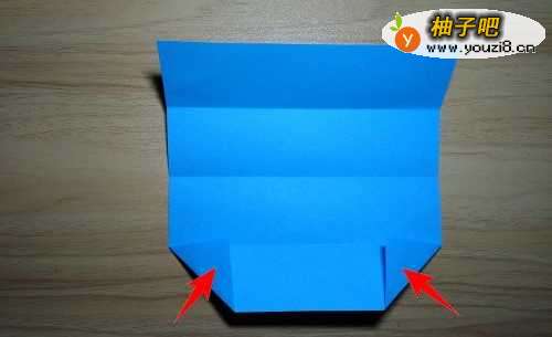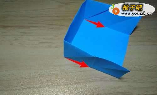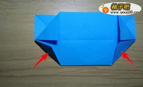 15左右两边分别折出垂直的角后,把箭头所指的那部分再折一下,使得折痕加深。