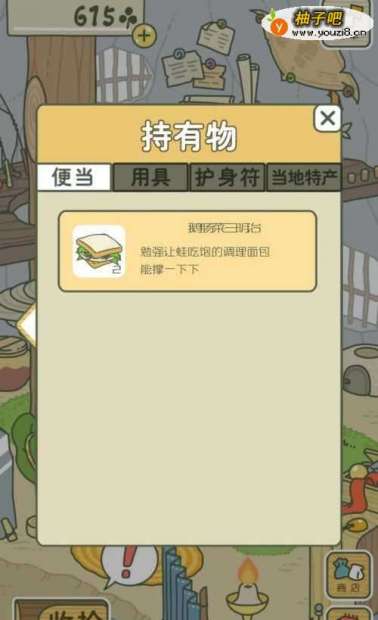 3点击便当的虚戴物线方框进入持有物,添加需要的食物。(添加的便当、道具、护身符需要提前在商店里购买)