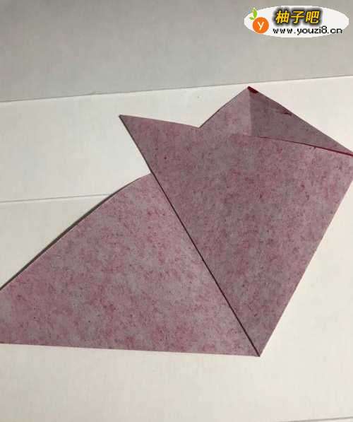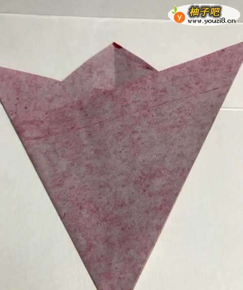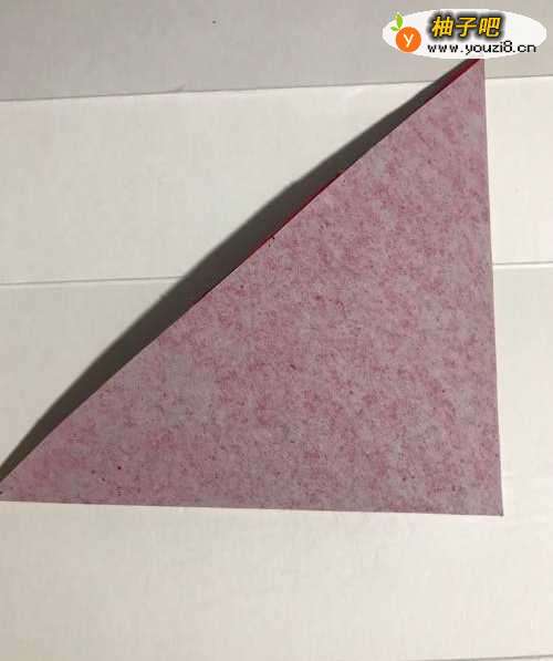 第一步 取一张长X宽都是16厘米的正方形红色彩纸 先把它从下向上对角折叠整齐 然后再从右向左对角折叠一遍