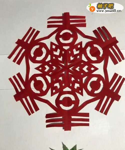6第六步 剪完外围多余的空白彩纸之后 再剪里面的细节部分 镂空部分 还有其他涂实的部分等等 全部剪完之后 展开压平 一幅简单漂亮的六春团花图案就裁剪完成了