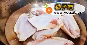 2鸡翅焯水,下姜片、料酒、葱祛除腥味,至鸡翅可以用筷子插进去捞出过凉水,以免黏在一起