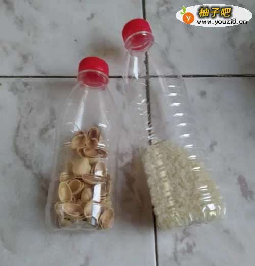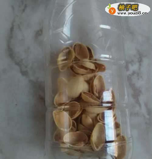 2在一个空塑料瓶中放入一些开心果壳,大约放瓶子的五分之一就可以。
