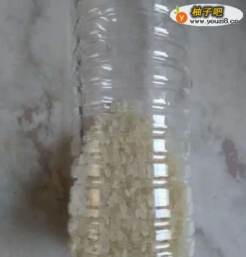 3在另一个空塑料瓶中放入一些大米,用量也是瓶子的五分之一。