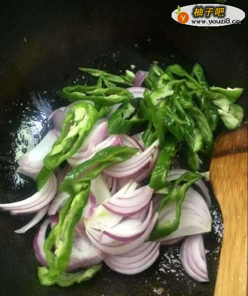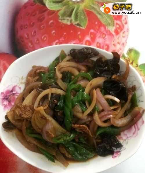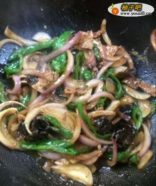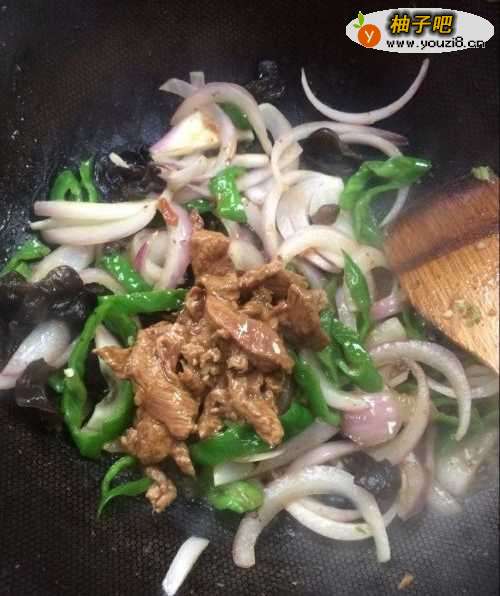 4锅里的余油烧热下洋葱青椒翻炒,加点点盐加木耳继续翻炒。