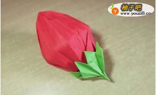 按照草莓本体的折法,折成第七步的样子,如图所示,然后展开。