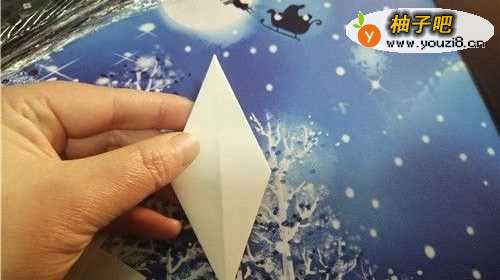 3把彩纸翻到另一面,上下对折,如下图的样子。