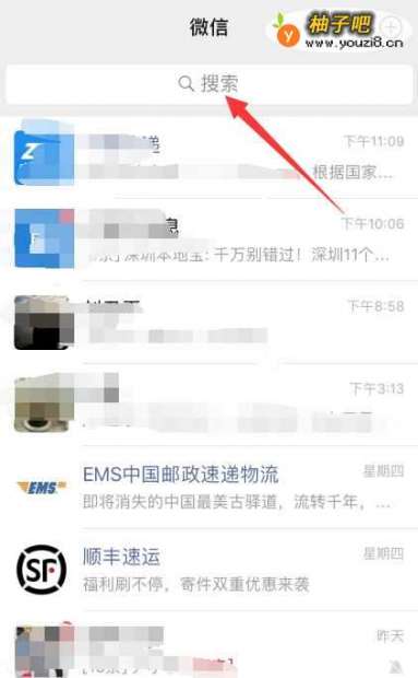 首页我们需要使用微信。打开手机中的微信,进入微信首页,点击页面上方的搜索入口。