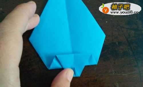 5把下面的角向上折到折痕,如图一。然后再把彩纸中间对折,如图二。把上边的角向内折一点,如图三。