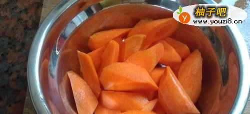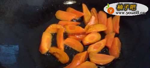 8跟着就可以把事先煸炒过的红萝卜放入一起烧制。