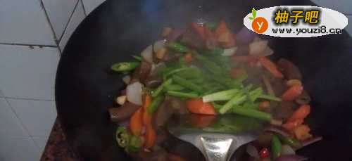 9再放入青红椒与洋葱,最后放入葱段,大火翻炒均匀即可。