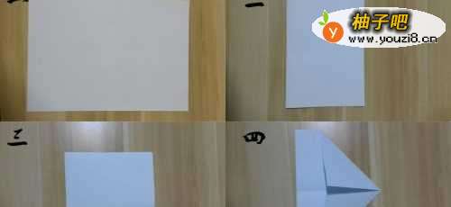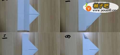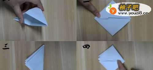 2这步把下面长方形条状往上折如图一、图二,把反面的也折过来如图三、图四,成为三角形状。