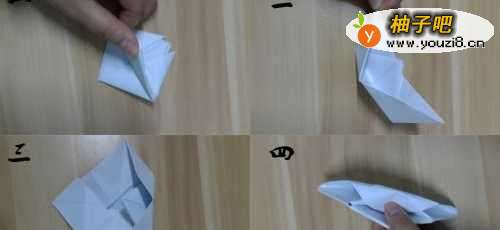 5现在折到了最小块正方形纸样了,把下面的角稍稍的折下,如图一。这是为了做船底。接着把两侧向外拉伸这时已经形成了船形。把船的里面有个角边拖出来,折翻到船底。另一角边也是如此。