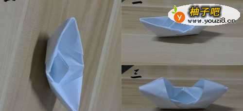 6剩下的这三个步骤就很好做了,找船里面两边的蓬,我们将这两边的蓬给拉起来,这样的纸船是不是就很完美了。