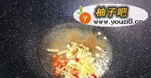 4起锅烧油,下入全部姜丝,一半小米辣,一半蒜末,爆香