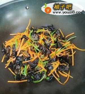 6随后加入木耳青椒丝翻炒均匀 听到木耳噼里啪啦爆开的声音再炒个20秒就差不多可以出锅装盘待用了