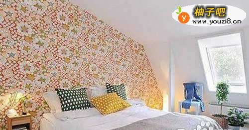 8位于顶部的阁楼,有着个特别的斜屋顶,于是,壁纸的贴设也跟着倾斜起来,却演绎出别样的不规则美,壁纸本身的选择较为明艳的颜色与图案,十分适合采光不是特别充足的小卧室。