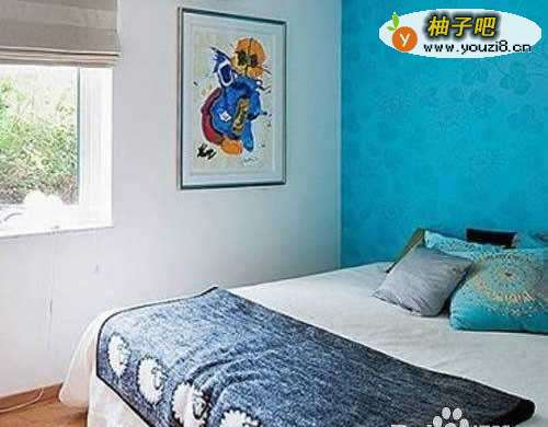 租屋的卧室几乎空荡荡的几乎只有一张铁艺床,茶几也是用板凳来代替,但这种简陋丝毫不能影响卧室清新淡雅之风,小卧室的魅力完全在墙上绽放,配色上其实很讲究的融合了蓝色与米黄。