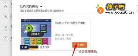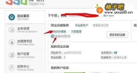 4注册后会提示绑定需要装修的店铺,绑定完成后点击我购买的模板装修淘宝店铺【图片第二个箭头指的方向是详细装修视频】