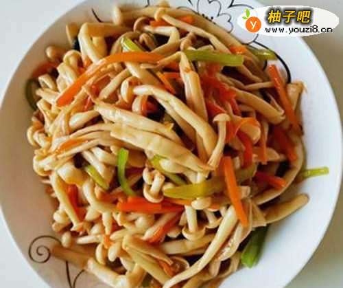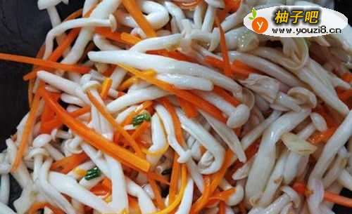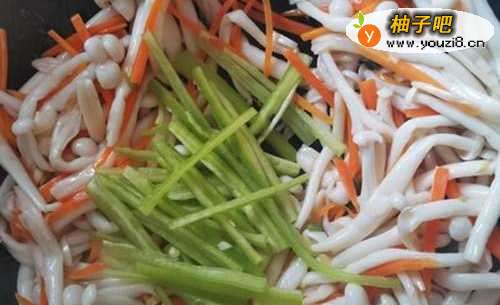 4然后加入胡萝卜丝翻炒,再加入白玉菇翻炒