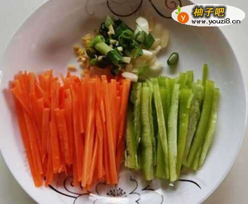 2胡萝卜和青椒切丝,葱姜蒜切末备用